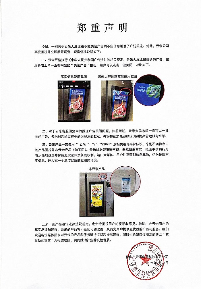 9月28日,该事件一度登上微博热搜。一天后,云米通过官方微博发布声明回应称:云米大屏冰箱推送广告右上角一直有明显的“关闭广告”按钮,可一键关闭。客服与用户沟通时造成了误解,将加强客服培训和管理水平。