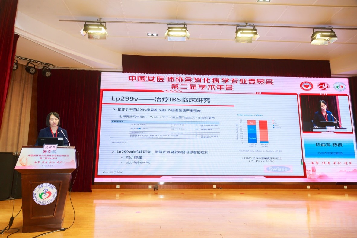 专题会议上,大会主席,北京大学医学部副主任、北京大学第三医院消化科主任医师段丽萍教授,分享了肠易激综合征这一消化科常见疾病的最新研究进展,并详细分析了肠道微生态对肠道健康的作用与影响,包括植物乳杆菌299v对机体的影响及对肠易激综合征患者的治疗作用。作为被世界胃肠病学组织推荐和认证的菌株,植物乳杆菌299v对改善患者的腹痛和腹胀症状有显著作用。