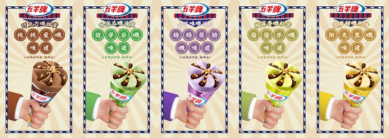 五羊以香芋、巧克力、哈密瓜、菠萝、榴莲五种口味经典口味,分别对应不同场景的味道:放学后的味道、偷偷乐的味道、纯纯爱的味道、妈妈奖励的味道、阳光里的味道,在来往的民众心里投下一枚重磅记忆炸弹。