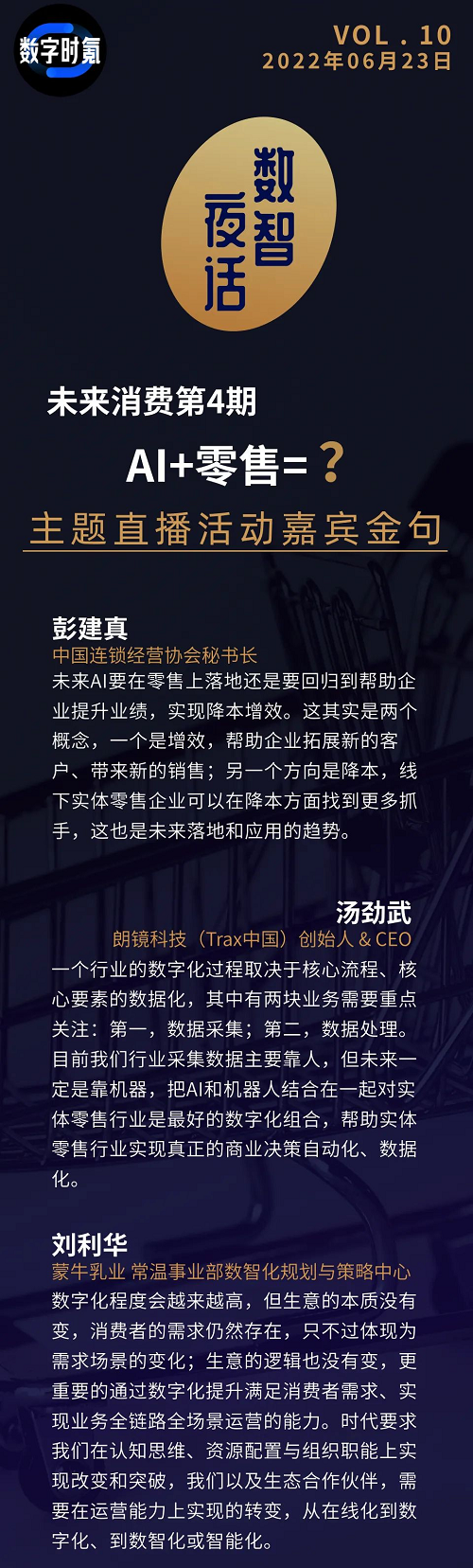 在6月23日的数字时氪「数智夜话」直播中,中国连锁经营协会秘书长 彭建真、朗镜科技(Trax中国)创始人&CEO 汤劲武、蒙牛乳业 常温事业部数智化规划与策略中心 刘利华,畅聊AI+零售会碰撞出怎样的火花。