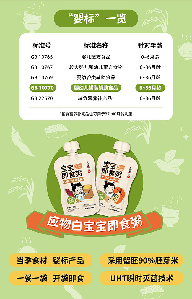 既然是带孩子出游,在食物选择上,考虑的也就更多,既要保证能量供应和营养补充的需求,又要满足出行且轻便、卫生、耐储存的需求。在此背景下,应物白专为6月+宝宝打造了这款宝宝即食粥。