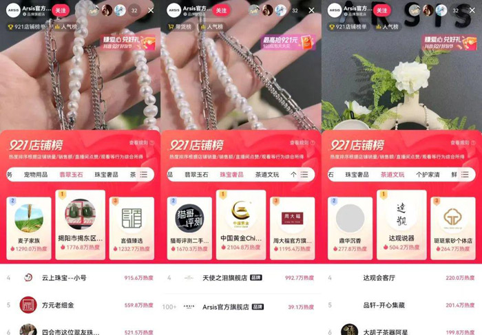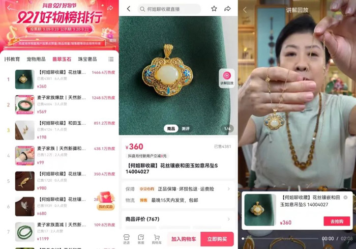 比如在「翡翠玉石」榜单中,一款由@何姐聊收藏 推荐的和田玉吊坠曾以1466.4万热度排在榜首,这款彩宝出自“京城花丝打卡点”——方元老细金店铺,由非遗技艺下的花丝镶嵌八大技艺制作而成。921期间,方元老细金不断强化“手工制造拥有机器生产替代不了的温度”相关内容,通过直播间讲解彩宝知识、手工制造如何分辨等内容成功出圈;同时,店铺还增设了「讲解回放」功能,让错过直播的人也能收看精彩内容,以内容提升用户投票偏好,促进了产品销售。