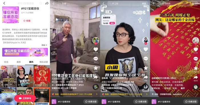 在#921宝藏添妆 话题下,马未都配合「东方美学馆」主题直播,率先发布优质内容,以短视频形式展现《弥勒经变图》3年打磨背后,对“一生只做一件事”的工匠精神的敬意,让用户从东方美学传承中引发现代生活方式的思考,成功勾起了人们对遇见宝藏好物的期待。大量明星、创作者通过讲述手工包、刺绣、油纸伞、珠宝设计、手串等具有文化属性的物品,发布了「遇见宝藏」相关概念视频,让#921宝藏添妆话题突破4500w播放量,并衍生了一系列子话题。