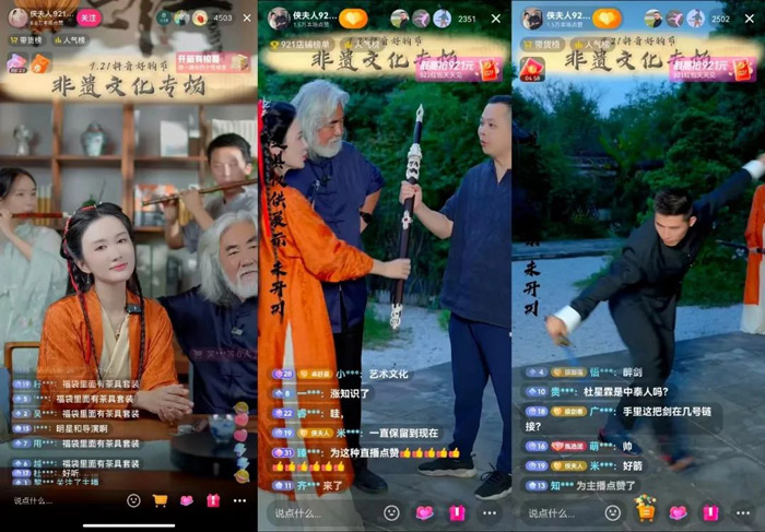 值得关注的是,知名武侠片导演和制片人张纪中老师,在921好物节期间首次亮相珠宝潮奢行业活动。在「非遗文化专场直播」中,张纪中夫妇与沈广隆剑铺的传承人沈州共同推广非遗文化——著名非物质文化遗产龙泉刀剑。除了讲述宝剑发展史、锻造工艺以及各类宝剑背后的寓意外,非遗传承人还在直播间带来了竹笛表演、武术表演等,让观众真正地沉浸在武侠世界中,感受传统文化的底蕴。