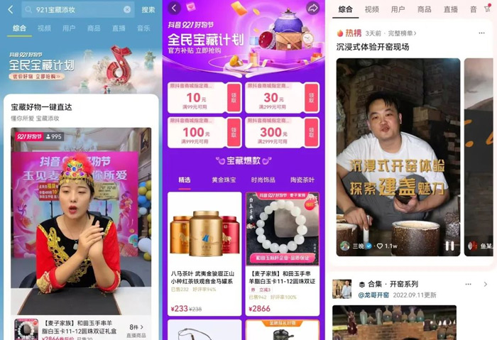 作为「藏宝图」四大主题玩法之一,龙梓嘉为代表的“东方美学馆”特色玩法凭借着对传统文化独到的见解与时尚审美取向,让大众在921好物节期间耳目一新。以此为开端,“开窑寻宝记”主题活动在9月17日接棒登场,抖音电商珠宝潮奢行业聚焦“沉浸式体验+开窑探秘”两大元素,为月记窑、戏墨柴窑、宁封窑、九禾龙窑等窑口举办了开窑线上直播。同时开启#沉浸式体验开窑现场挑战赛,邀请达人通过讲述开窑文化、陶瓷窑口故事和烧制原理、工艺,展现中国传统文化。