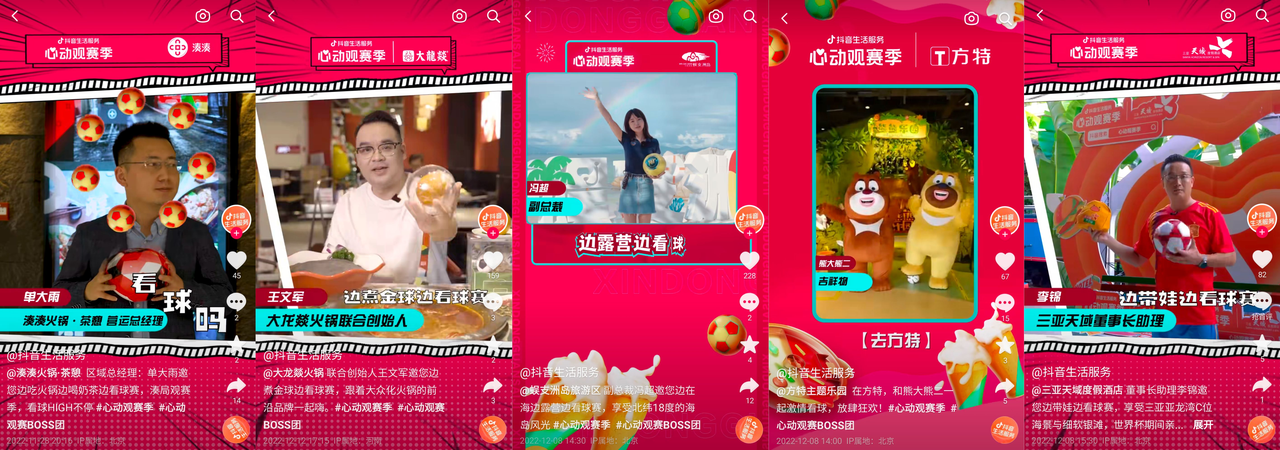 作为本次“心动观赛季”的亮点之一,“心动观赛Boss团”解锁了平台和品牌商家联动的全新方式,72家品牌BOSS从幕后走向前台,化身“推荐官”为品牌及活动打call。通过颇具趣味性的短视频、定制化的海报,搭配Boss场景化的推荐语,为用户带来100种新奇、新潮、有新意的观赛选择。无论是聚会观赛、独自观赛、亲子观赛等等,都能按照Boss安利的观赛方式激情看球,放肆狂欢。