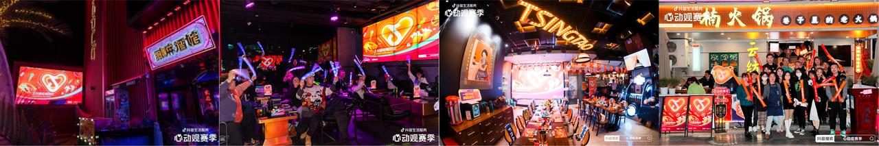 位于沈阳市和平区的“贰麻酒馆沈阳旗舰店”,在店内一楼中心设置了LED大屏幕,各分区四周及回马廊里还配有10余台电视屏幕等,供球迷看球。场地经过布置后氛围浓郁,环境前卫潮流,是沈城年轻人热衷的观赛打卡地。位于青岛市的“Tsingtao1903(凯德店)”,是青岛啤酒的直营门店,致力于为消费者打造全新啤酒文化和饮食体验。为配合心动观赛季活动,Tsingtao1903除了在全店面内铺设活动专属物料,还推出了“1903炫彩加油罐”、“纯生球迷狂欢罐”等创意产品及玩法,让热爱啤酒和足球的年轻人一起为世界杯尽情欢呼。更有抖音达人共聚楠火锅、何师烧烤,现场举办世界杯主题趴,伴随热气腾腾的美食,度过难忘的观赛之夜。