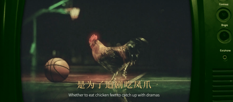 当然除了葫芦娃系列,王小卤甚至在第三支短片中搞起了王家卫风格,通过一只鸡的视角,去回应当下年轻人一直抱怨做人太难的问题,同时短片中我们还可以看到《重庆森林》、《阿飞正传》的影子……这些充满哲学和唯美画面的融合,加上最后“王家味,就是这个味”的点题,也实现了很好的呼应。