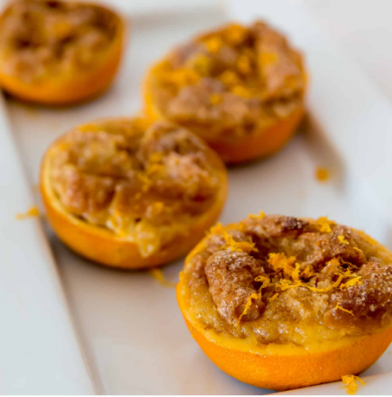 5.小心地舀起羊角面包混合物,将新奇士肚脐橙子倒满一半。撒上肉桂糖。