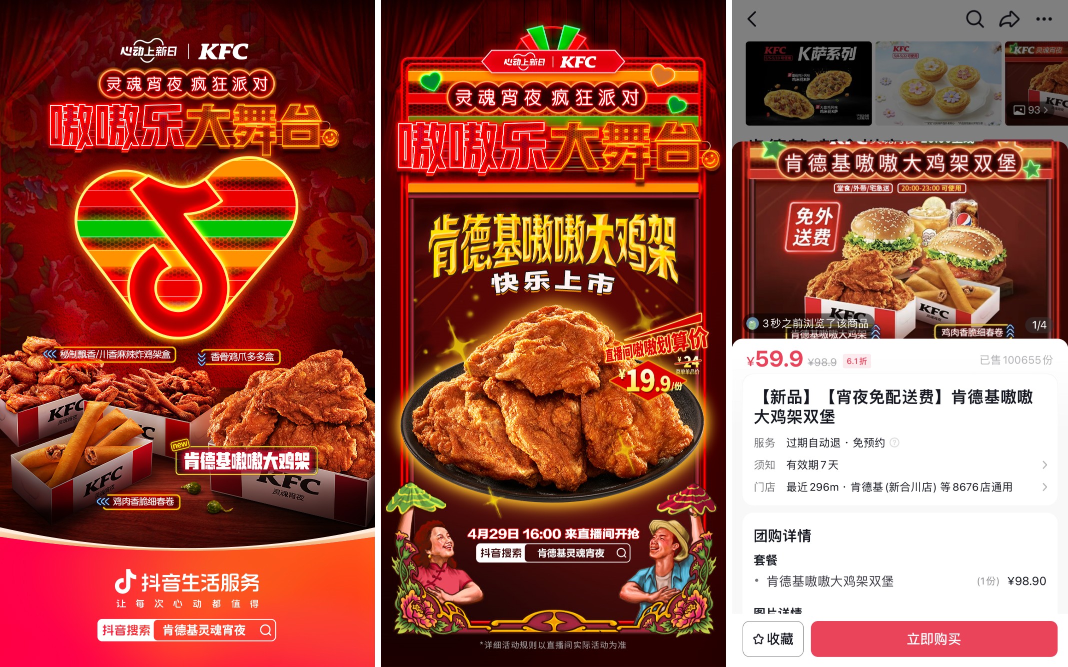 此次是肯德基灵魂宵夜与抖音生活服务「心动上新日」的再度合作,相比以往,肯德基对于平台的玩法更显得心应手,对于平台的体系化运营思维更加成熟。从推出区域特色宵夜新品、联动超头达人短视频及直播、场景化品牌自播等组合经营手段,实现与用户的深度沟通,进一步强化消费者对于肯德基灵魂宵夜的情感认同,通过可持续运营与长期打造实现用户精准触达、新品销量转化和消费场景创新的“人货场”三赢效果。