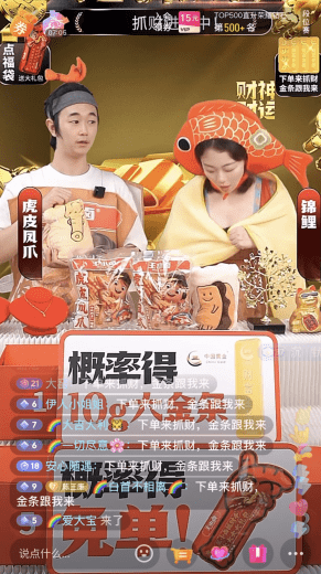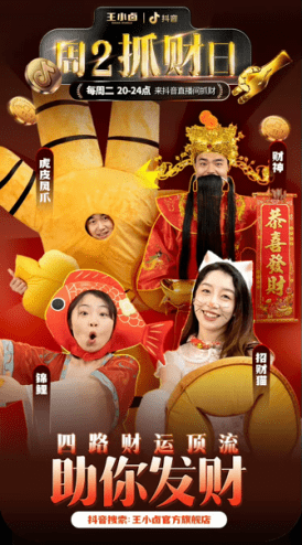 结合鸡爪在中国文化中有抓钱爪的别称,寓意能够抓财运、福气运、婚姻姻缘运等,且“鸡”与“吉”同音,吃鸡就是图个“大吉大利”的好彩头,吃鸡爪自然引申到“抓财”的好运寓意。因此王小卤独家首创“抓财”直播概念,并打造了虎皮凤爪“抓财手大大大大大礼包”,从主题到产品都呼应“抓财”这一吉祥寓意。王小卤在抖音策划了独家首创的“周二抓财日”概念主题直播,通过“抓财”的概念,让更过消费者在吃到好吃的虎皮凤爪产品的同时能收获到一份财运和福气。