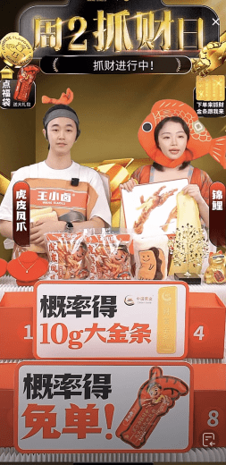 “周二抓财日”不仅内容沙雕上头,这实打实送黄金的玩法也很“财大气粗”。深谙当代年轻人求财心理的营销,在首次开播试水就取得了不错的成绩!