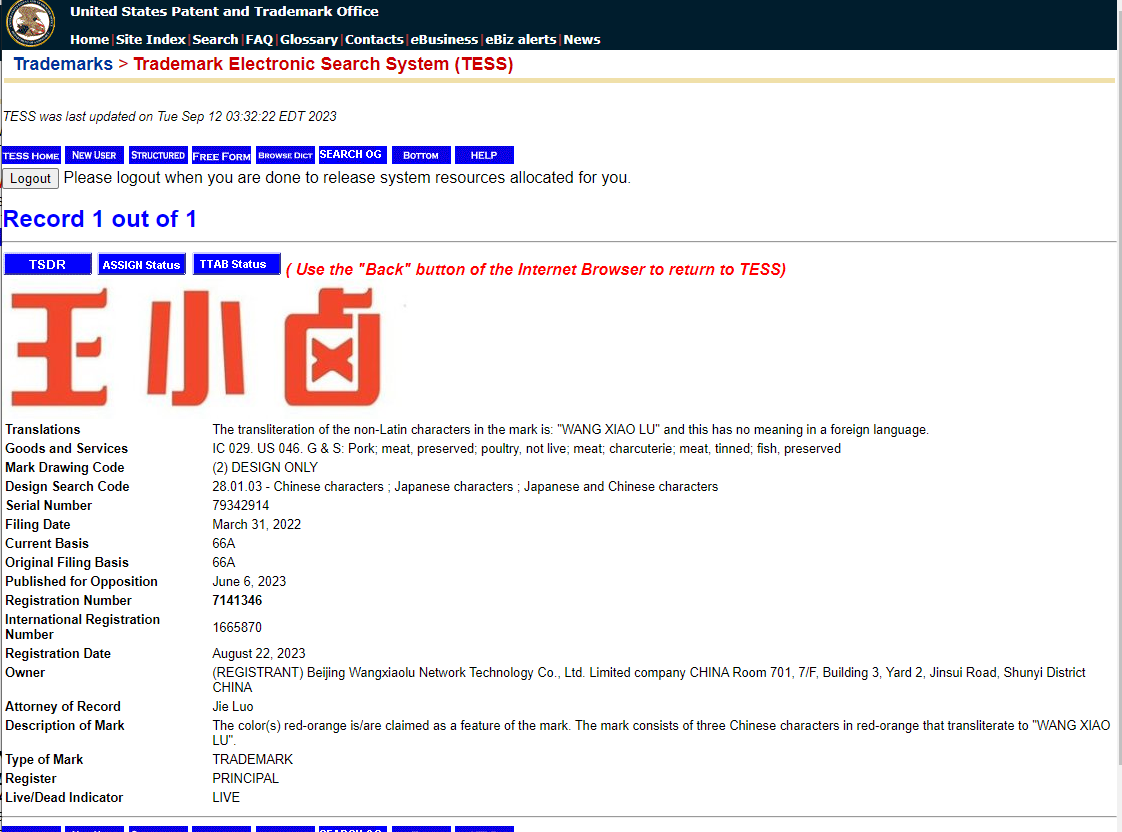熟悉卤味品牌的话,不难发现受到外国人喜欢的鸡爪,正是来自国内卤味零食品牌王小卤的虎皮凤爪。带着“王小卤要发力出海美国了?”的疑惑,笔者查阅了美国专利及商标局的官网,发现王小卤已经在今年6月份完成了在美国的商标注册。而此前,王小卤已经获得出口资质,远销马来西亚、新加坡、新西兰等海外市场,并在今年5月进驻了马来西亚潮流食品连锁店MIX。