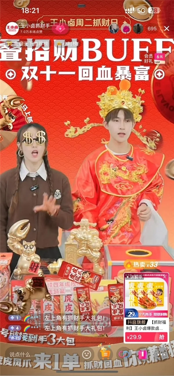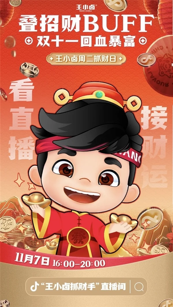 据了解,王小卤抖音直播以“抓财接财运”的形式打造出了品牌独有的“周二抓财日”。即每周都会在直播间策划一场“抓财”活动,通过“下单抓财”的互动玩法让更多消费者在品尝美味虎皮凤爪的同时,还能收获一份带来福气和财运的礼品。