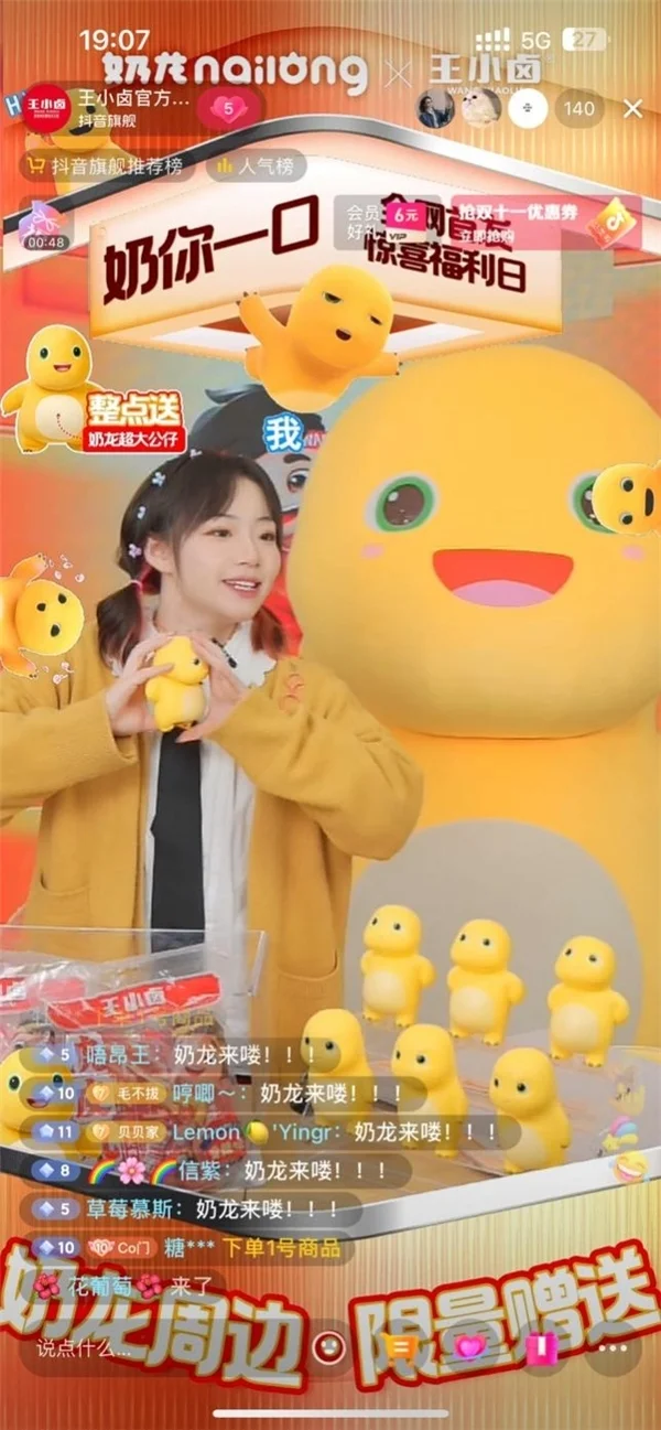 作为品牌重要的渠道平台,王小卤在抖音上的玩法可谓是不断迭代。上半年3·8、大剧营销热门CP“青风徐来”合体空降直播、618联名乌苏策划“上头之夜”直播,下半年双十一,王小卤不仅迭代了“周二抓财日”的全新玩法,还通过和超人气国漫奶龙的首发直播来为销售赋能加码。
