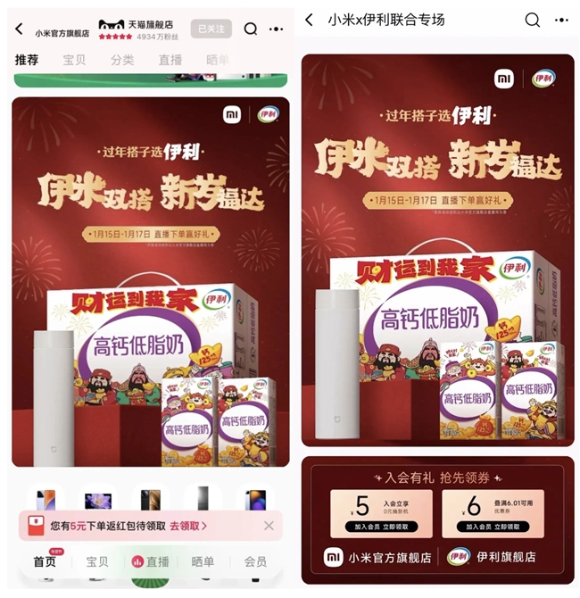 「伊米双搭」联合打造了新春“好搭子”电商活动,伊利与小米电商联合页面与专题共建,采用多维站内权益组合,如充分布局店铺首页轮播、店铺搜索品牌专区、店铺首页弹窗与会员中心,在黄金资源位实现强势引流,在高流量场景潜移默化影响消费者心智的同时,全面引爆联合事件影响力。