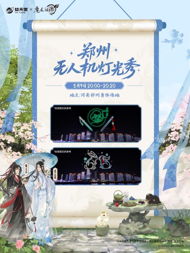 《魔道祖师》动画作为播放量超百亿的国民级IP,其“国风美学天花板”的标签与益禾堂此次联名高度契合。自5月1日预热启动,品牌持续点燃市场热情:悬念期的「江湖小报」系列视频以泛黄卷轴、避尘剑影等元素埋下线索,播放量破5万次;预热期公众号官宣视频播放量超60万次;数据显示,5月8日开售当天,#益禾堂魔道祖师动画#话题阅读量破亿,联名周边霸榜社交平台。5月9日,郑州奥体更将上演“无人机灯光秀,打造线上线下联动的沉浸式消费场景。