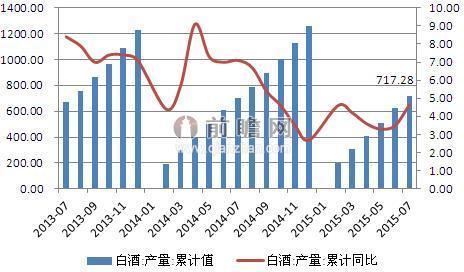 经过2012年前黄金十年的积累,在各地政府、企业、各路资本的共同推动下,我国白酒行业的产能已经严重过剩,每年的产量过剩超过500万千升。2015年1-7月白酒累计产量为717.28万千升,同比增加4.65%,我国白酒产量保持稳定增长。