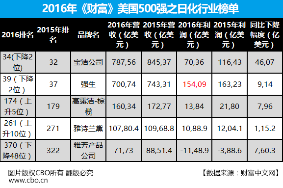 尽管在2016年榜单中,宝洁仍是日化行业的第一,但其名次、营收和利润均有不同程度的下滑:排名由去年的第32名下降到34名,营收和利润也下降明显,营收从845,37(亿美元)下降至787,56(亿美元),利润直接下降46,07(亿美元)。