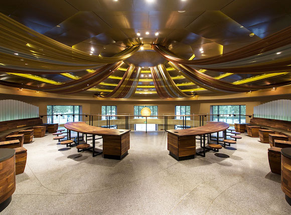 这家旗舰店的设计采用的是“咖啡剧院”的概念,设计团队对界面新闻记者表示,因为圆顶建筑非常容易让人想到剧院的设计,所以这个想法在最初就获得了共识。虽然是开在迪士尼小镇,但是星巴克更希望能体现自己的品牌特性,在整体设计上,它仍旧延续了简洁明快的工业设计风格。