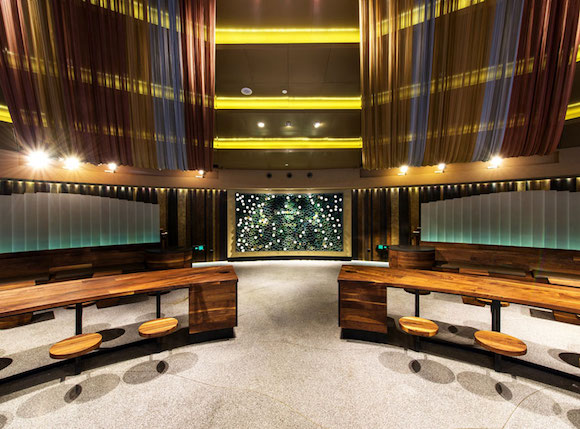 整个门店由天然木材和反映咖啡农业的原材料打造,为了反映“剧院”主题以及配合圆形建筑物的设计,门店从吧台、桌椅到地面的纹理和楼梯都呈弧线形,而波浪形的穹顶内部则有金色和白色金属丝线,类似剧场的帷幕。