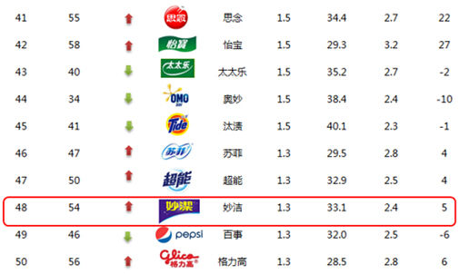 值得一提的是,在此次众多品牌中,妙洁排名再创新高——总排名第48,比去年上升了6个名次,在家用类品牌中表现不俗。