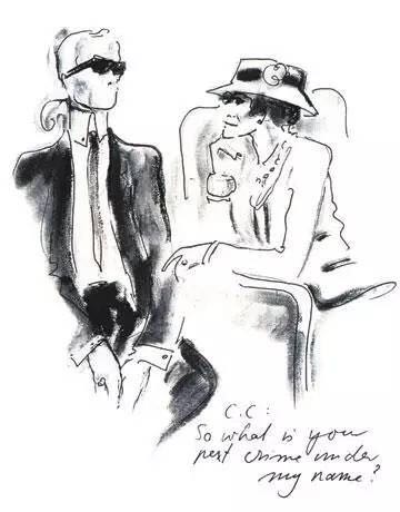 (上图:Karl Lagerfeld创作的描绘与Chanel女士交谈情景的速写作品)