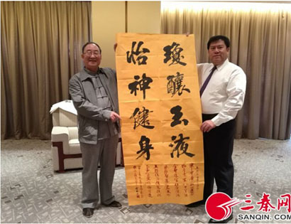 全国政协委员、中国书法家协会理事、陕西省书法家协会名誉主席雷珍民挥毫泼墨,书写"琼酿玉液怡神健身”赠予五粮液。