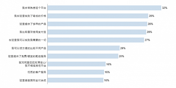 1/3的受访者把“熟悉度”列为依赖阿里平台的首要原因。除此之外,他们还看中还阿里平台提供的便宜的价格、一站式购物体验和便捷的支付系统。