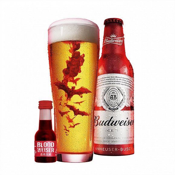 此外,消费者还可以在百威的一些“快闪吧”饮用到“血色百威”(Bloodweiser)特饮。在啤酒中滴入红色的果浆提取物,将杯中大麦色的酒体染成血浆般的色彩,也是挺有万圣节气息的——不过据说这个特饮配方据说没什么特殊口感,仍然是百威啤酒熟悉的味道。