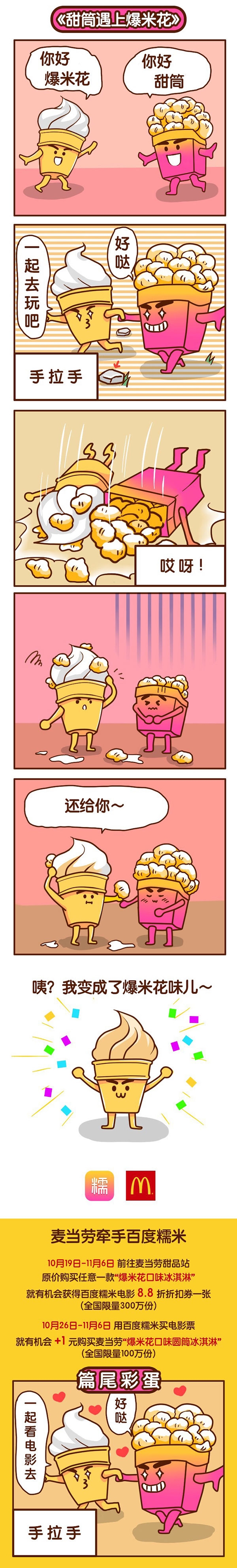 如果产品自带萌点,品牌主们自然要好好挖掘一番。百度糯米电影和麦当劳联合发布一组故事漫画,讲述从甜筒遇到爆米花,再变成爆米花味儿的故事,给奇妙口味的诞生一个“合理”的解释。