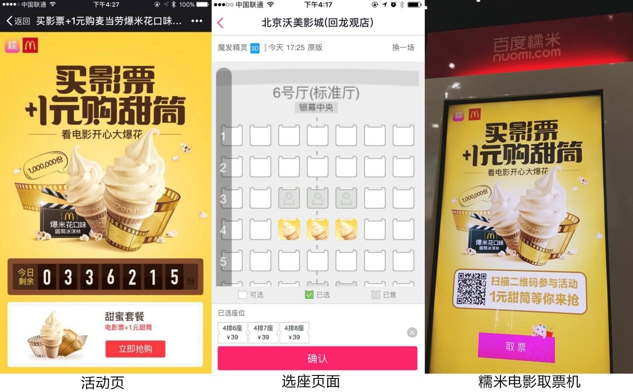 百度糯米电影:推出买电影票+1元购爆米花口味甜筒,带着甜筒看电影。产品菜单也别出心裁,在百度糯米上选座位的时,选座图标会变成爆米花口味甜筒。