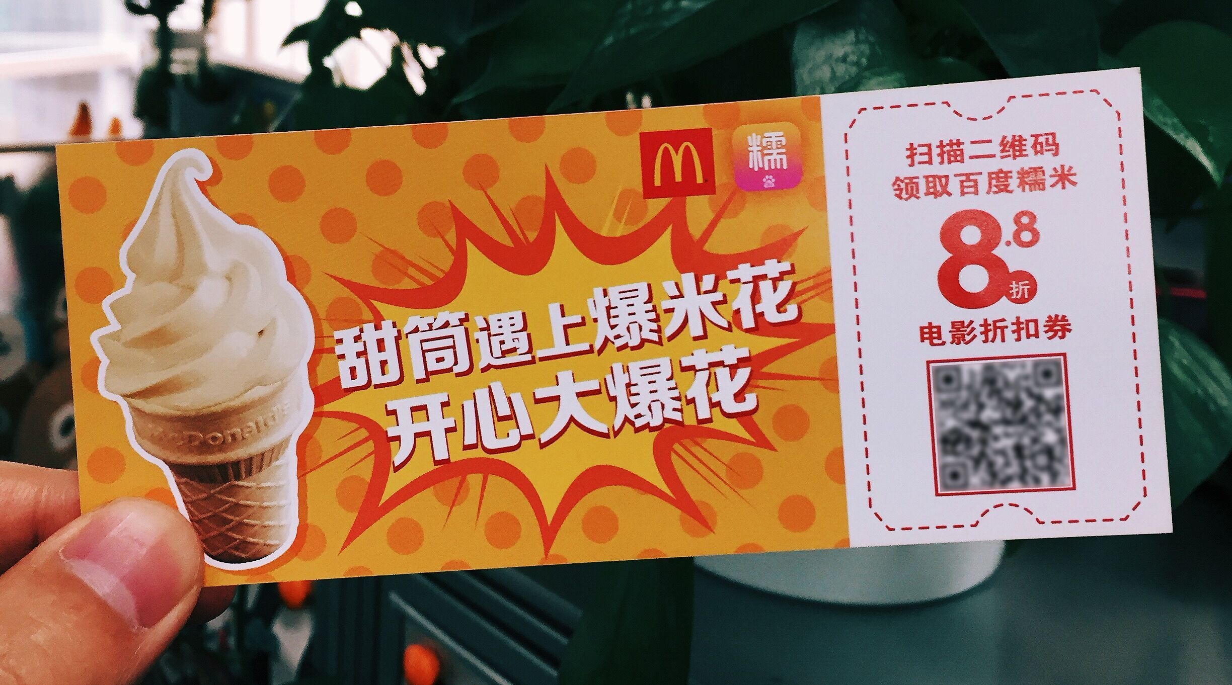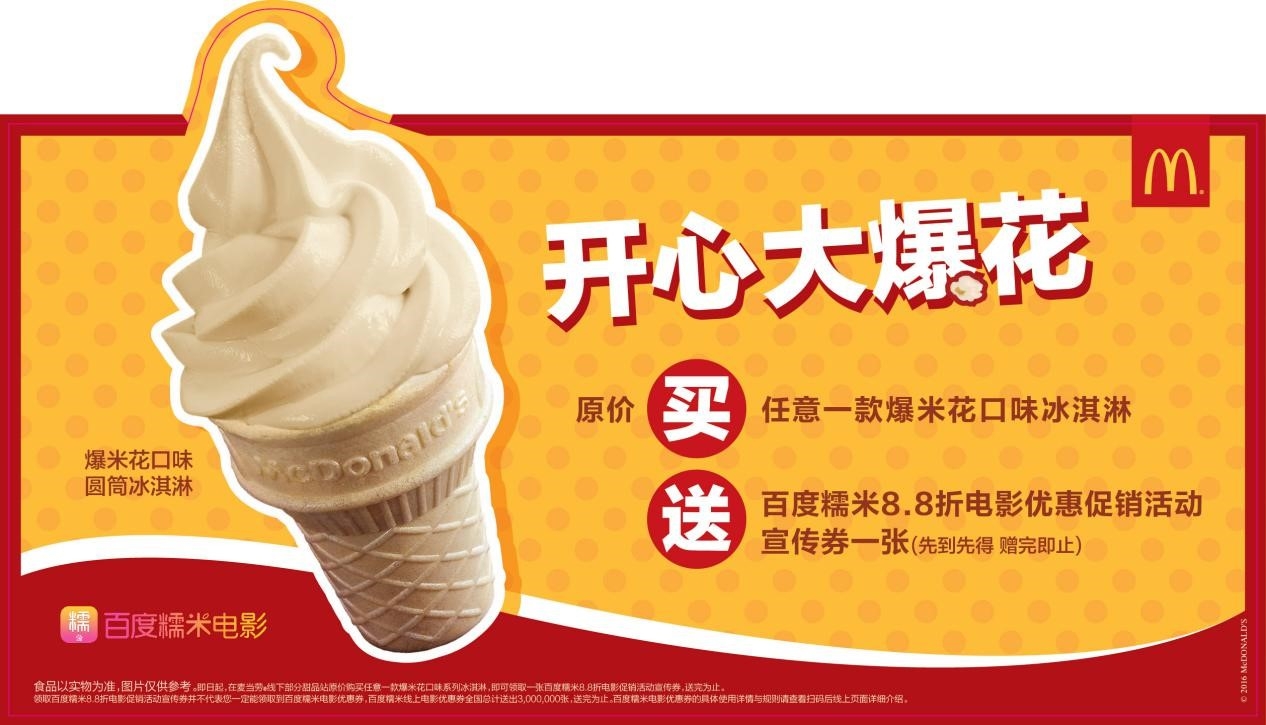 麦当劳线下餐厅:为每一个购买爆米花口味系列冰品的消费者提供一张88折糯米电影折扣券。两大品牌围绕电影院观影场景,互相转化用户与消费,将线上的转到线下,将线下的再引导回线上。实现带有粘性跨界的消费模式,增强对双方品牌的认知与好感。