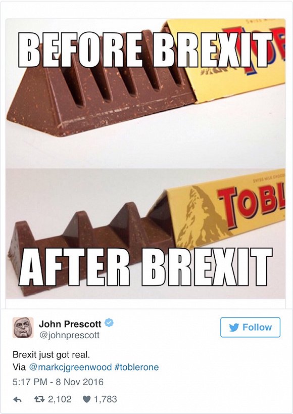 不少人也把此次事件跟英国脱欧联系了起来。6月23日英国退欧通过公投后,英镑兑美元和欧元汇率均大幅跳水。此后苹果公司在英国地区将旗下产品提价20%,而英国传统食品马麦酱在超市的价格也大涨了12%。因此,亿滋国际发言人公开表明此事与脱欧无关的言论也似乎并不令人信服。