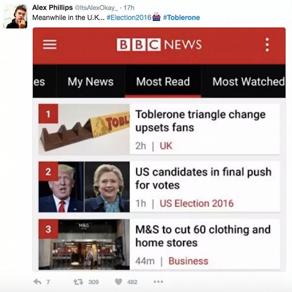 英国消费者发现著名的瑞士三角巧克力“缩水”了,此事引发众怒,相关报道在BBC上的热度甚至一度超过美国大选。