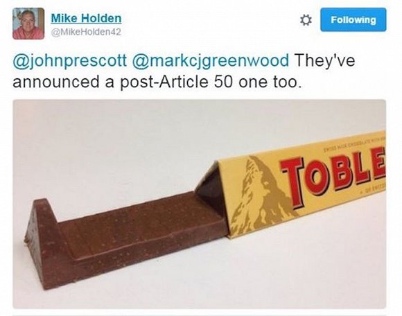 英国人民担心此事不会就此罢休,一位名为MikeHolden的用户猜测,A50条款触发后(触发A50条款意味着进入脱欧正式程序),三角巧克力会不会变成下面这样?