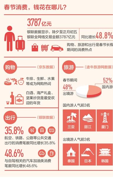 中国银联的统计显示,鸡年春节长假前6天(除夕至正月初五),银联全网络交易笔数2.86亿笔,交易金额3787亿元,同比分别增长10.7%和48.8%,意味着6天的交易金额已超出去年春节7天假期3121亿元的交易额,创出历史同期新高。