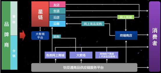 为品牌商提供一站式商品交易营销服务;为零售商增加门店收益;为消费者的生活提供更多的便捷。星链整合怡亚通上下游优势供应商资源,联合百万终端门店、广大消费者,以线上线下结合的方式,打造一个跨界融合、平台共享、共融共生的供应链商业生态圈。致力于为中小零售商创造一个共生发展的平台,将传统门店升级成为全新的“网上+网下”的自定义综合商城,不仅能售卖自己商店的商品,还能销售搭乘怡亚通供应链的40余万种来自各大品牌及全球的进口商品,同时,还具备消费金融服务、媒体服务、增强服务等功能,帮助中小零售商店做大做强。