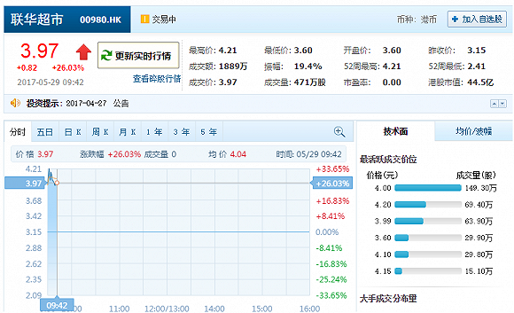 联华超市在香港大涨30.8%,创2015年4月以来最大涨幅。