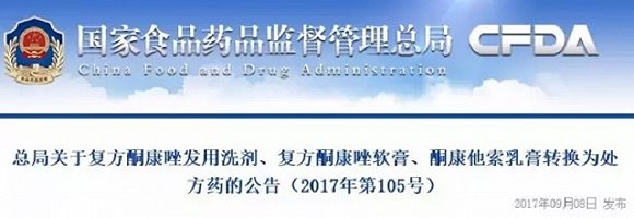 9月8日,国家食药监总局发布《关于复方酮康唑发用洗剂、复方酮康唑软膏、酮康他索乳膏转换为处方药的公告(2017年第105号)》。这三个品类,不再是OTC产品。