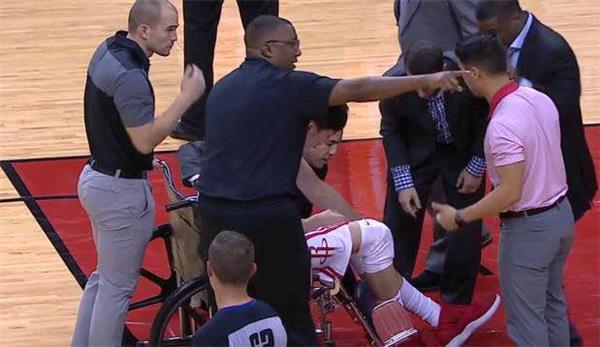 让我们把目光转向在NBA追寻自己燃球梦想的另一位中国球员——周琦。火箭在主场迎战上海大鲨鱼的季前赛上,周琦迎来了难得表现的机会。首节战至6分32秒,丹帅就早早把他换到场上。可是,意外发生在一瞬间,周琦在与斯科拉拼抢篮板的时候,膝盖刚好被失去重心的斯科拉重重砸到。随后周琦便一直无法起身,比赛被迫暂停。队医上场将周琦用轮椅推出场外。