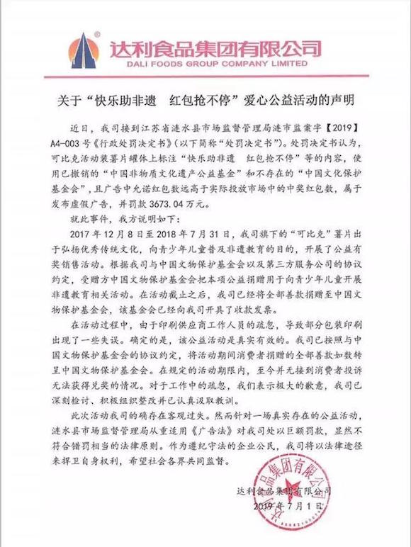 “此次活动我司的确存在客观过失。然而,针对一场真实存在的公益活动,涟水县市场监督管理局从重适用《广告法》对我司处以巨额罚款,显然不符合错罚相当的法律原则。”达利集团表示,“我们将寻求以法律途径来捍卫自身权利。”
