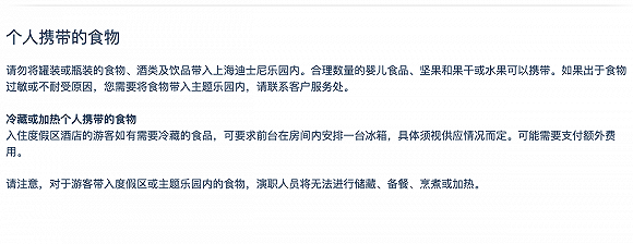 此外,上海迪士尼的“为有特殊饮食要求的游客提供的服务”中显示,可以携带的食品有:“合理数量的婴儿食品、坚果和果干或水果可以携带。如果出于食物过敏或不耐受原因,您需要将食物带入主题乐园内,请联系客户服务处。”