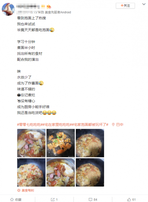 突如其来的超长假期,全民宅家都修炼成了厨师,而泡面是我们囤货普遍的、食物!泡面的花式吃法玩法你知道多少?直至#宅家泡面都被玩坏了#话题登上热搜榜,小编本人才发现自己简直是井底之蛙(哭唧唧ing),作为一个吃货小编,学起来~增加自己的吃货资本!