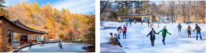 溜冰场由人工冰区以及天然冰区组成。10月初秋之际,人工冰区就可以使用,观看枫树秋叶的同时还可以滑冰,是这里独有的特色哦。到12月下旬之后,天然冰区也开始结冰,树叶隐匿于冰雪之中,若隐若现。