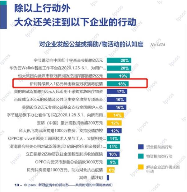 自新型冠状病毒肺炎疫情发生以来,众多企业投身其中,持续开展捐赠和援助行动,成为抗击疫情的中坚力量。其中,作为健康食品领域的龙头企业,伊利在这场“抗疫”行动中表现抢眼。在益普索Ipsos推出的《疫情影响下的消费者系列调研》中,“伊利持续投入1亿元抗击新型冠状病毒疫情”以18%的认知度位列快消品行业第一。