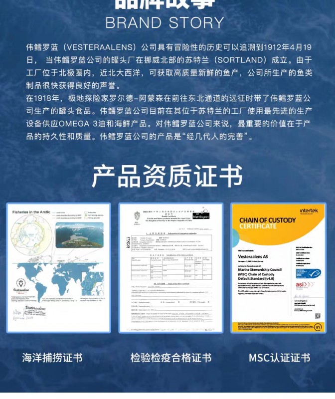 而且作为挪威的百年老店,伟鳕罗蓝(Vesteraalens)一直与MABIT(挪威Omega-3海洋油脂研究机构)合作,从鳕鱼捕获-原料加工-产品开发-物流运输等方面进行全产业链把控,在气味、过氧化值、茴香胺值、农残、重金属等核心指标上一直处于全球领先水平,并获得了MSC认证。对伟鳕罗蓝公司(Vesteraalens)来说,最重要的价值在于产品的持久性和质量,做到每一个环节都可控可追溯,以确保人们能食用到最优质的海产品。