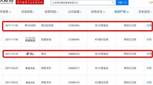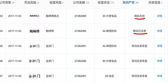 易尚公司的套路很明确,对一些具有初步知名度或者网红潜质的餐饮类、烘焙类品牌进行注册,例如围绕鲍师傅品牌,该公司申请了鲍才胜、鲍师傅、鲍家、鲍小贝等商标注册,“广撒网”后部分注册可以获得商标授权,同时加大研发产品,随之展开加盟。易尚甚至连电视剧“花间提壶方大厨”都尝试了商标注册。
