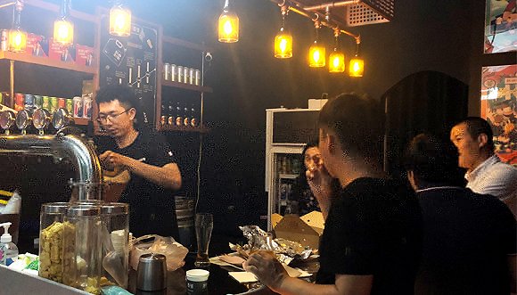 晚上6点,下班后,三五好友相聚在一间10余平米的精酿啤酒吧内,喝着啤酒畅谈着近况,该店虽不能提供餐食,但店内员工一边打啤酒,一边介绍道:“可以外带食物到店内食用。”他将手中打好的精酿啤酒转身送到顾客餐桌。