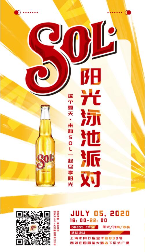 中国,上海2020年7月5日—上海的7月伊始,天气还有些阴雨绵绵,对灿烂阳光的渴望从未如此强烈。风靡全球的网红潮流品牌【SOL®苏尔啤酒】将于7月5日于上海西郊庄园举办阳光泳池派对。在这个日照时间逐渐变长的上海夏日,针对工作繁忙,或因天气而压抑的人们,SOL®阳光派对将以独特的太阳仪式和热情泳池为来宾们创造“点亮心情”的场景和“尽享阳光”的机会,鼓舞彼此成为如SOL®般的夏日追光使者,拥抱太阳的正能量,向更加光明的未来出发。
